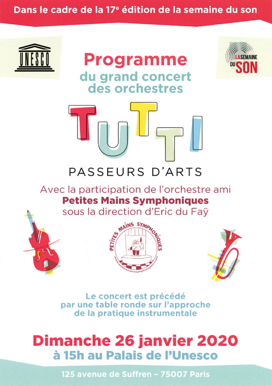 La semaine du son de l’UNESCO Président fondateur : C. Hugonnet Concert Tutti Passeurs d’Art sous la houlette de Jean-Claude Decalonne Invitée marraine : Esther Abrami Présentation : Virginie Aster Concert du 26 janvier 2020 à l'UNESCO